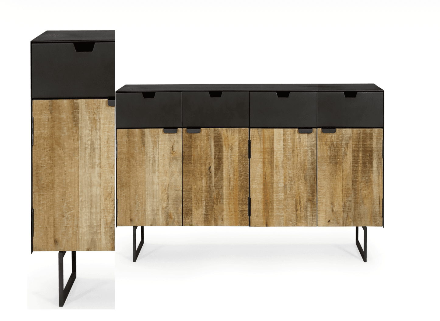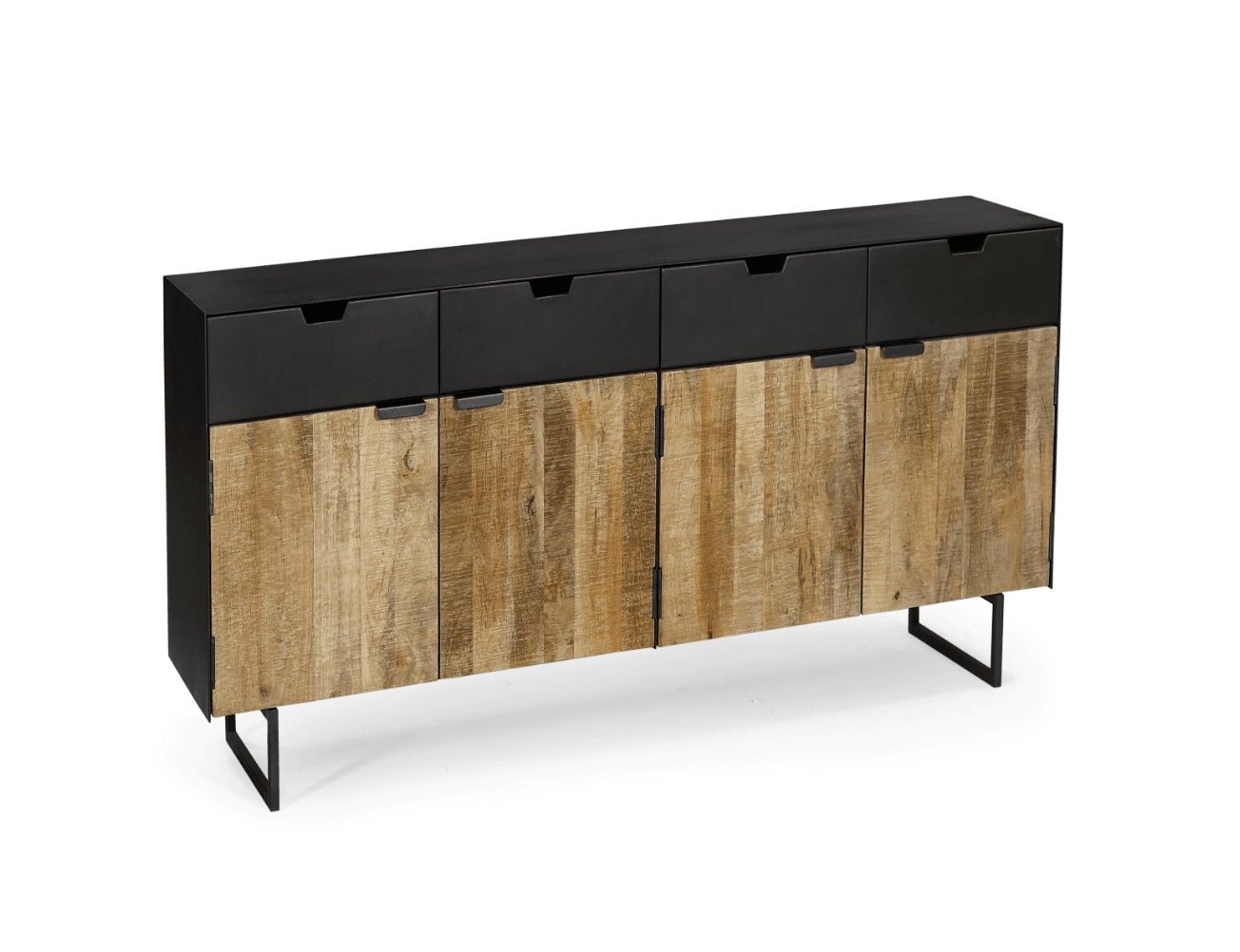 Il est doté de 4 tiroirs en métal, parfaits pour organiser votre linge de table, vos accessoires ou vos documents, ainsi que de 4 portes en manguier, derrière lesquelles se trouvent des compartiments spacieux permettant de ranger vaisselle, livres, appareils électroniques ou tout autre objet du quotidien.
