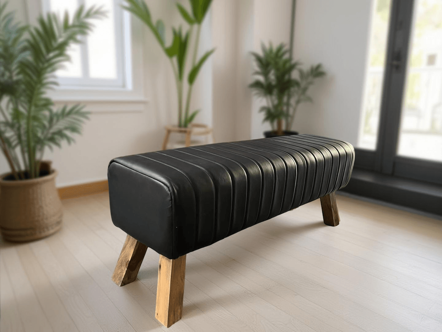 Banquette élégante en cuir de vachette noir, assise confortable et pieds en bois de manguier. Idéale pour entrée, salon ou chambre. Style chaleureux et intemporel.