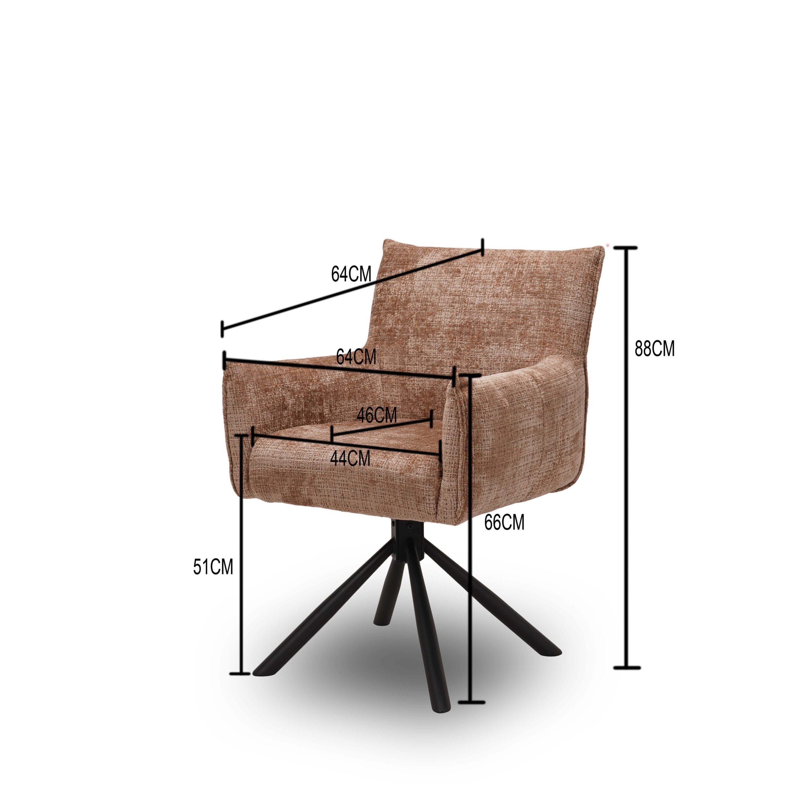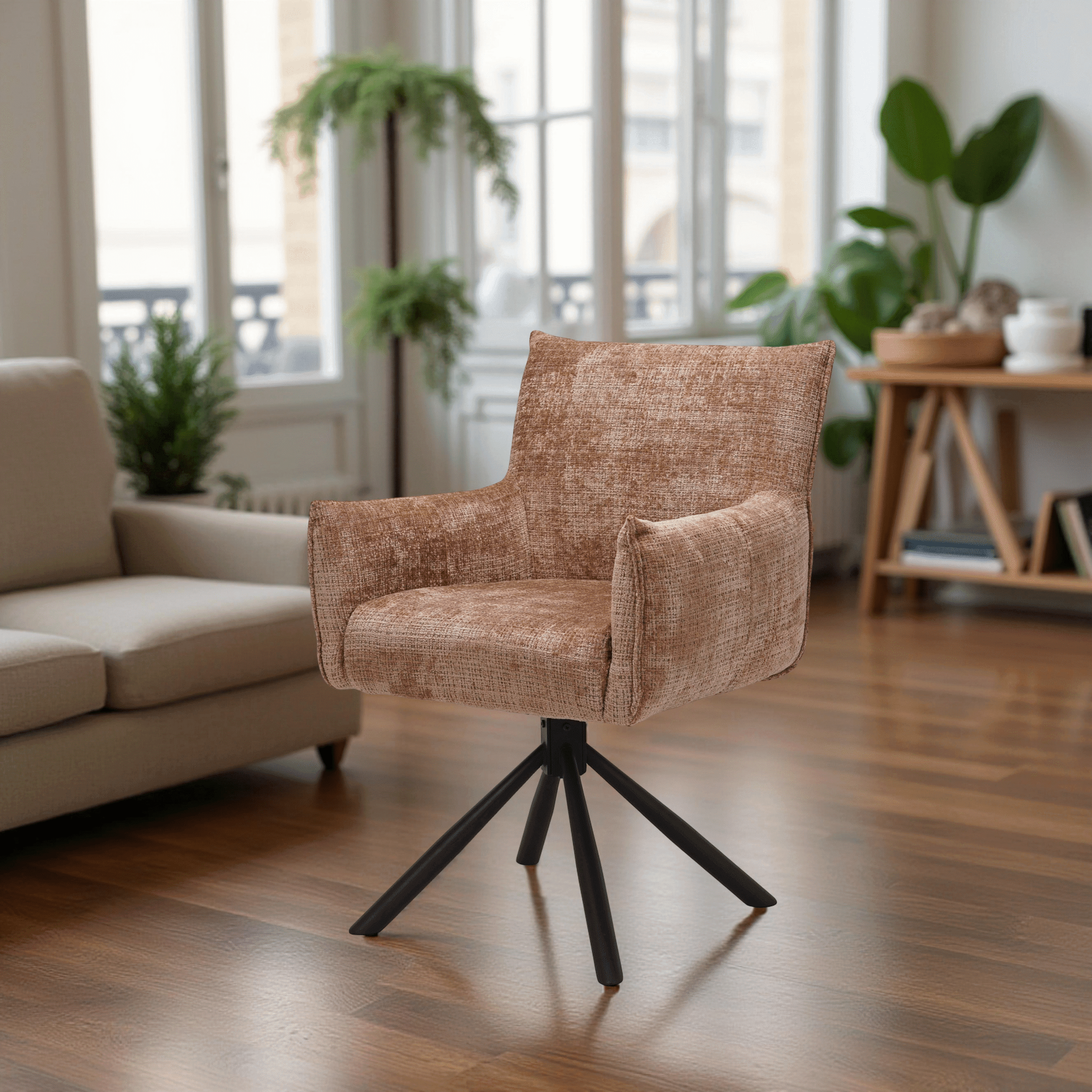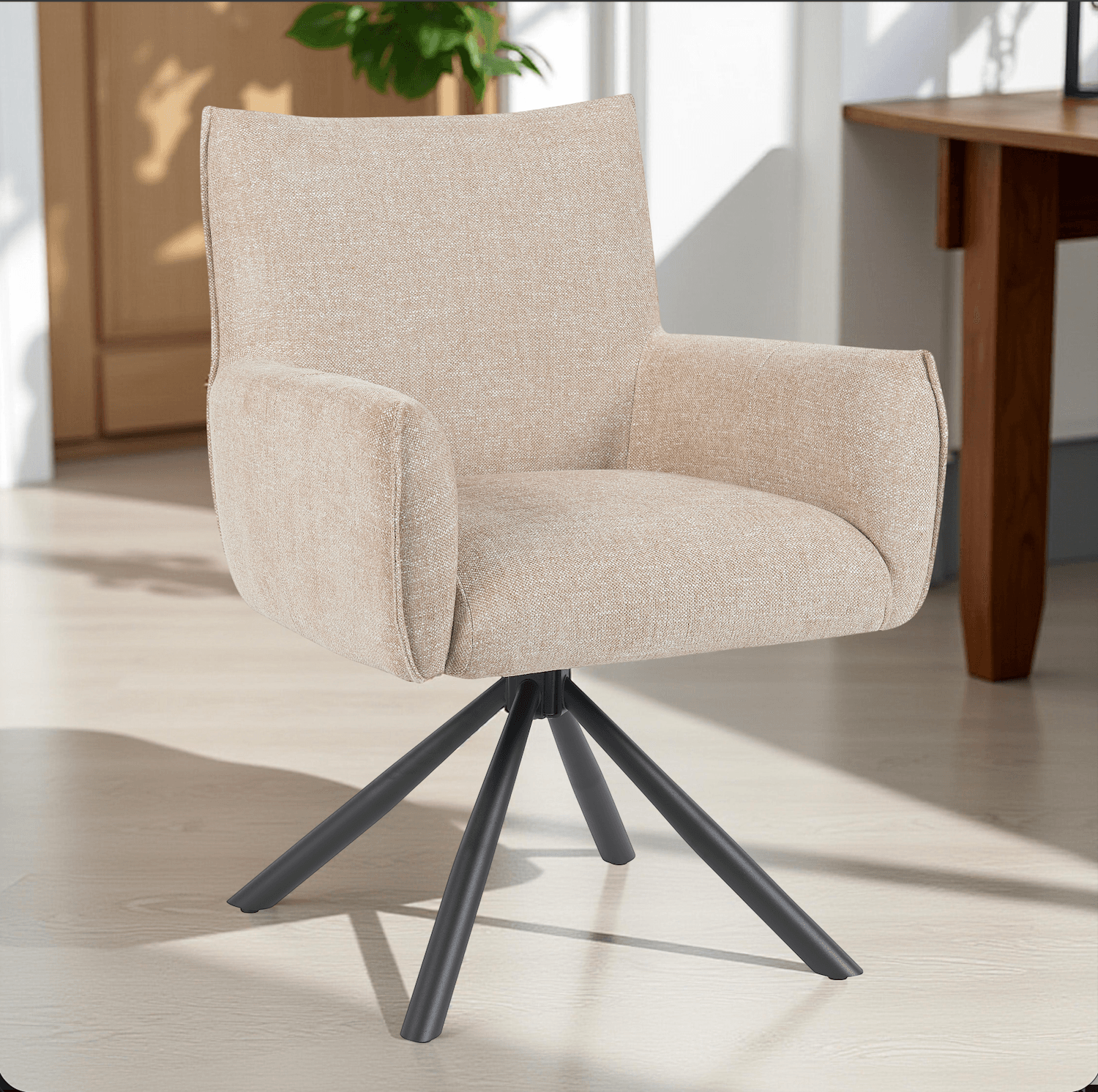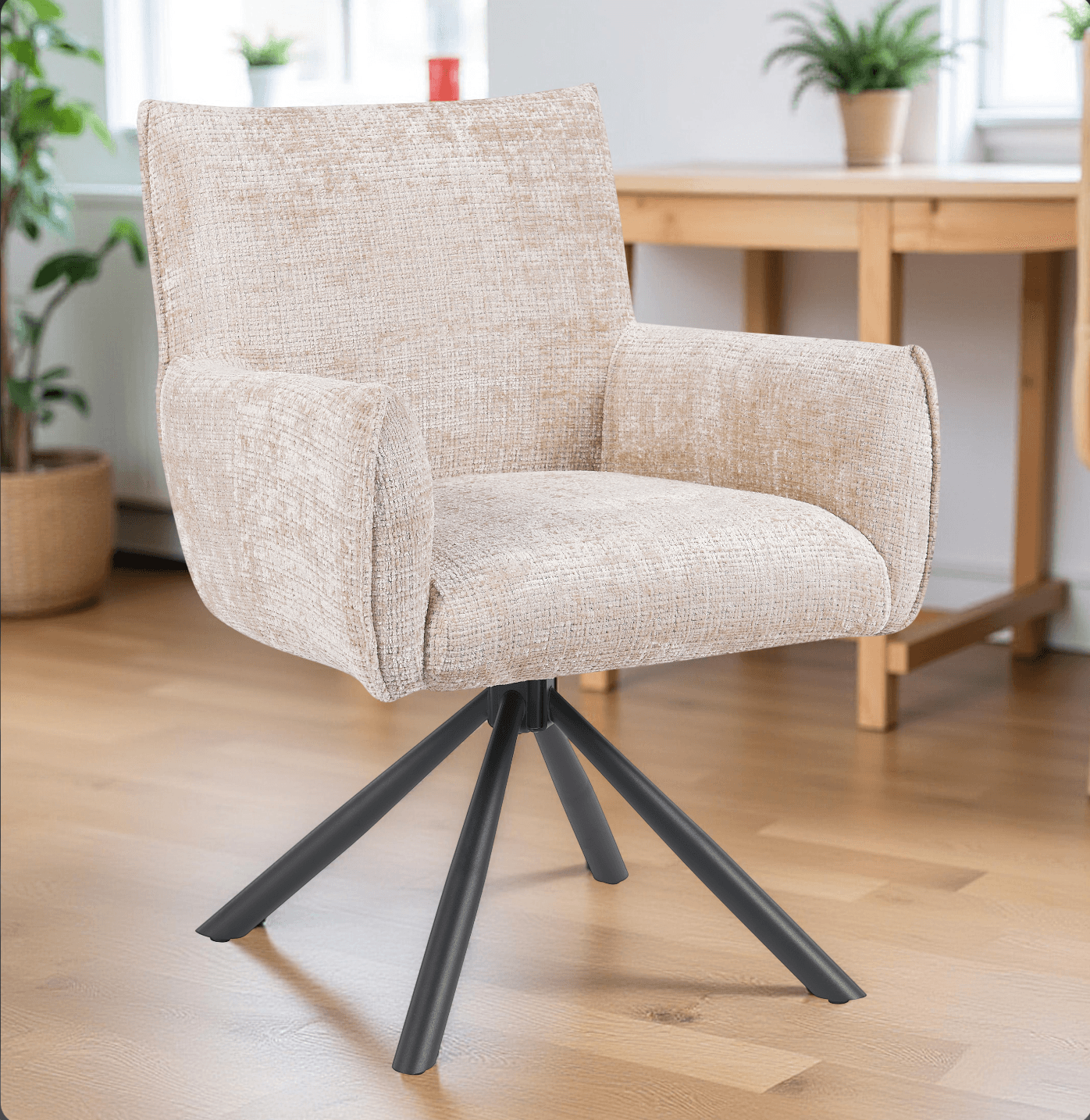 La chaise Chambon de Dwelling Interiors est une chaise élégante et confortable, habillée d’un tissu taupe aux nuances naturelles. Son assise généreuse, ses accoudoirs et son piètement métallique pivotant en font un siège idéal pour la salle à manger comme pour un coin bureau. Un design moderne, chaleureux et durable.