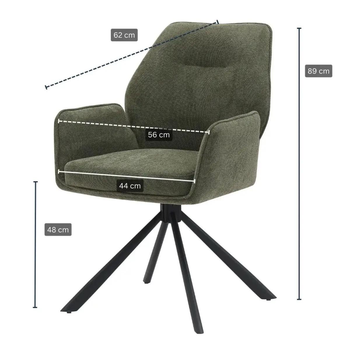 Nous avons privilégié votre bien-être. Avec une largeur d’assise de 44 cm et des accoudoirs positionnés à une distance de 56 cm, la chaise offre un maintien exceptionnel, même pour une utilisation prolongée. Sa hauteur totale de 89 cm et sa hauteur d’assise standard de 48 cm la rendent compatible avec la majorité des tables de repas et de bureau.