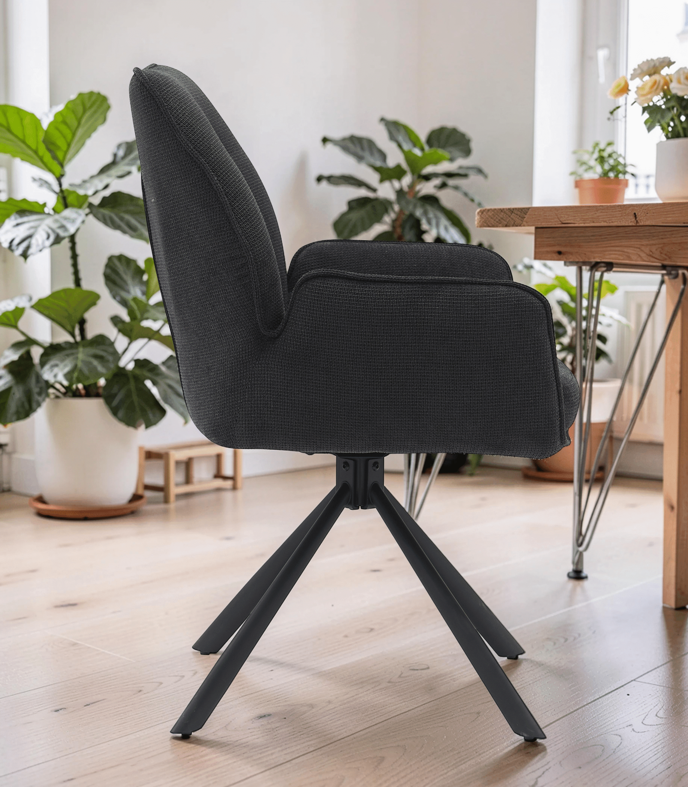 Ce qui distingue la chaise Castillon, c’est son mécanisme de rotation à 180 degrés. Conçue pour faciliter vos mouvements, elle intègre une fonction de rappel (reset) : dès que vous vous levez, l’assise pivote d’elle-même pour retrouver sa position initiale. Fini les chaises mal alignées autour de la table ; votre pièce reste parfaitement rangée sans effort.