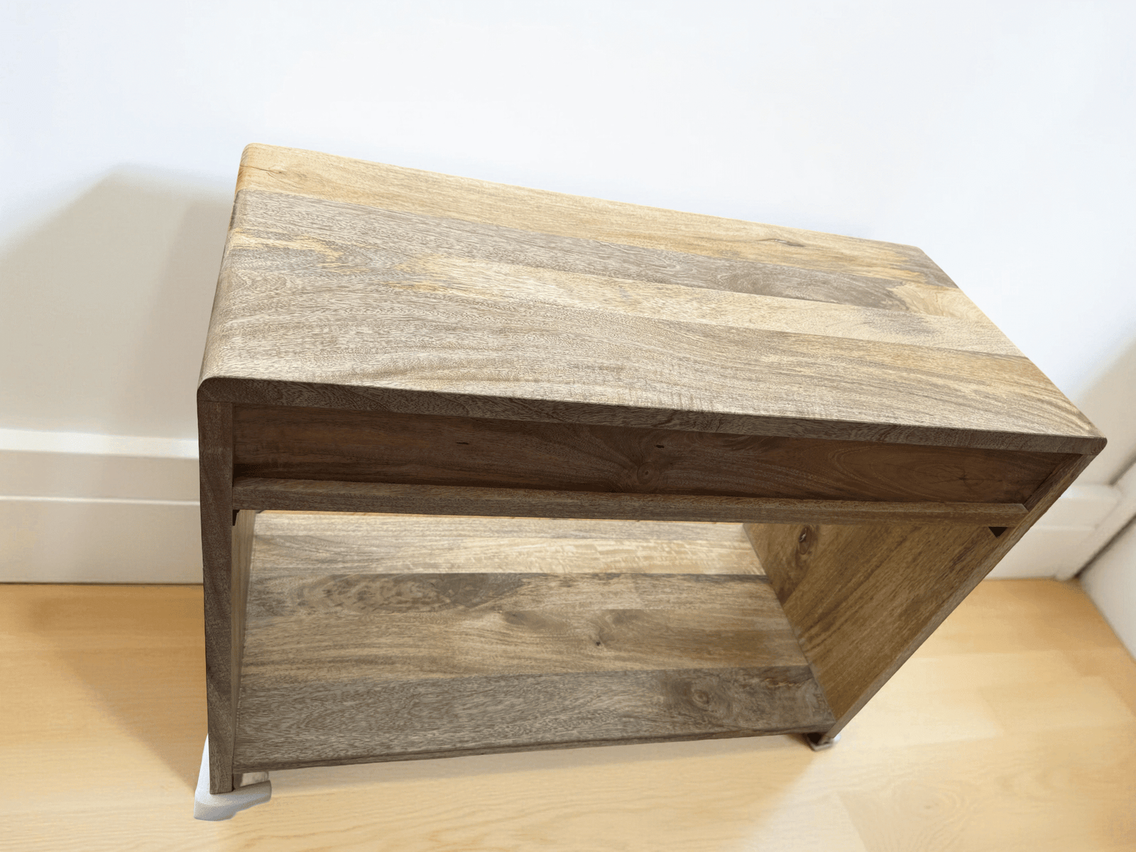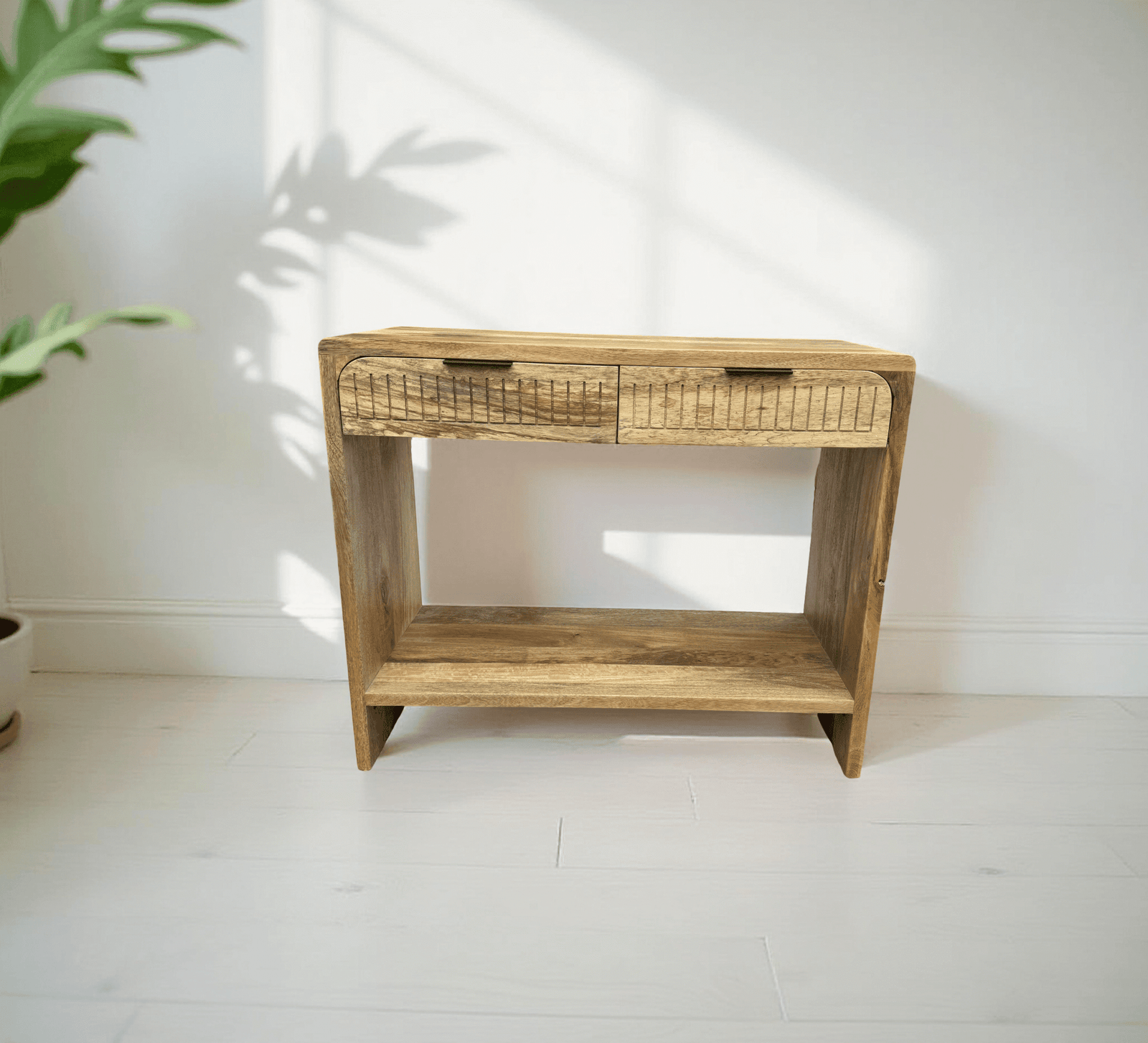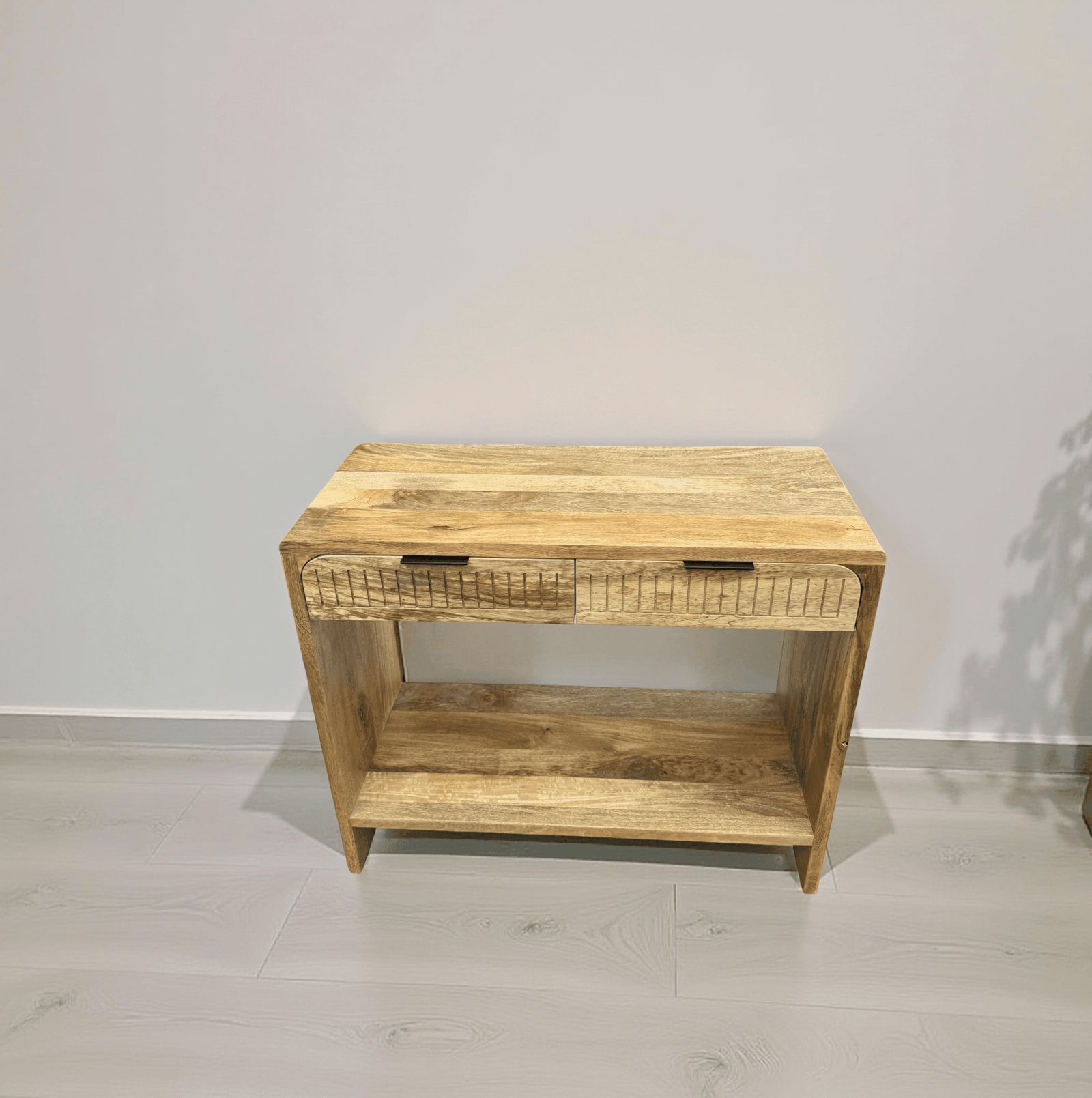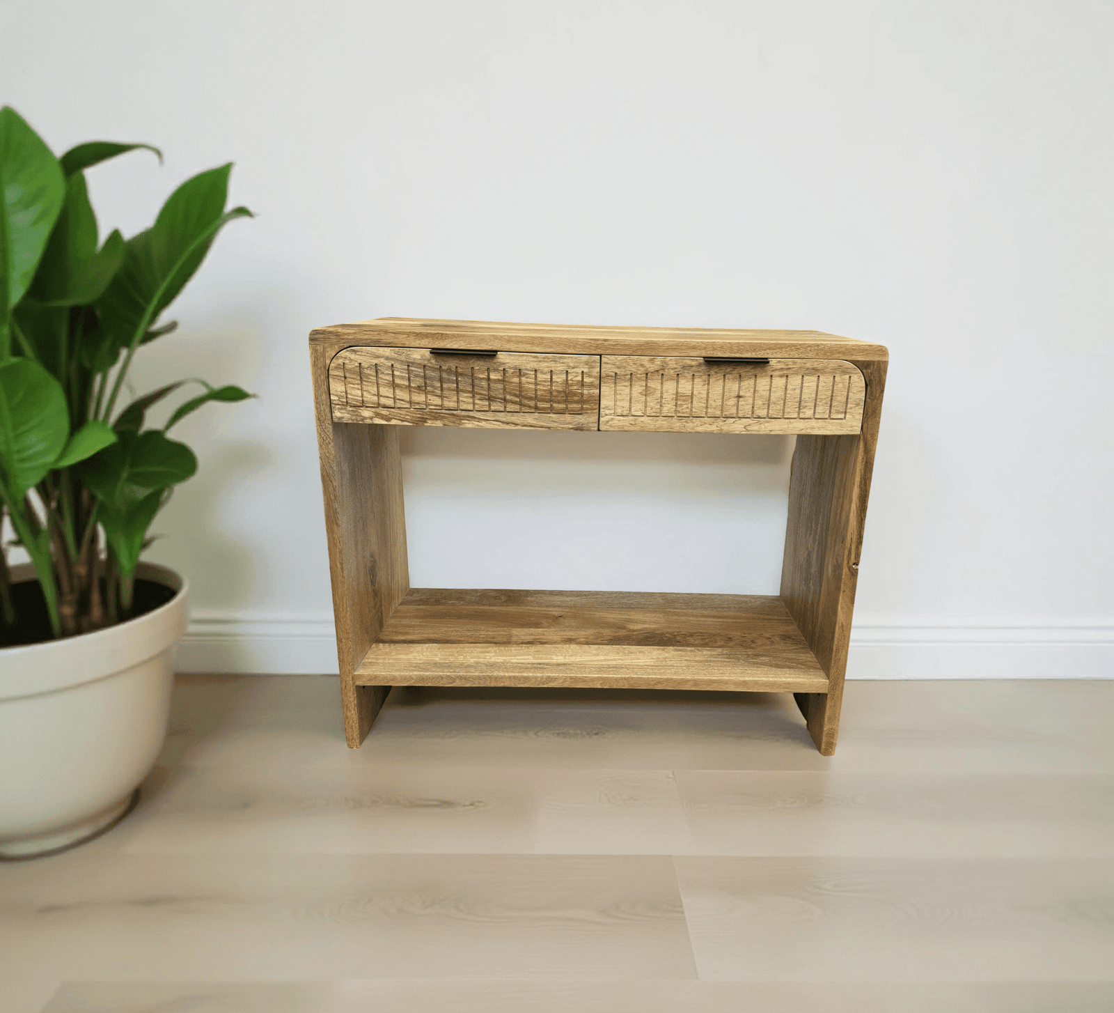 Console en manguier massif avec deux tiroirs sculptés. Design naturel, lignes modernes et rangements pratiques. Idéale pour entrée, salon ou chambre.