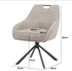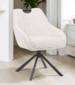 Le fauteuil Montbel de Dwelling Interiors combine design scandinave, confort et fonctionnalité. Son tissu clair, sa poignée intégrée, son assise pivotante et son piètement métal noir en font un siège élégant et pratique pour la salle à manger, un bureau ou le salon.
