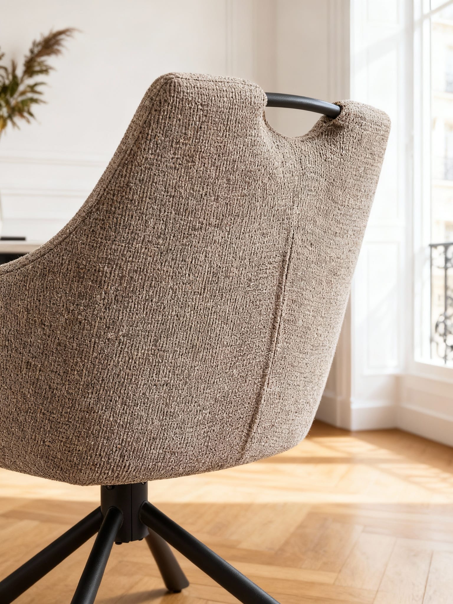 Le fauteuil Montbel de Dwelling Interiors combine design scandinave, confort et fonctionnalité. Son tissu clair, sa poignée intégrée, son assise pivotante et son piètement métal noir en font un siège élégant et pratique pour la salle à manger, un bureau ou le salon.
