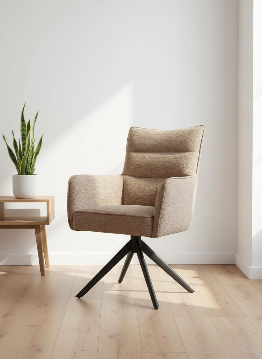 Découvrez le fauteuil Salagou, un siège pivotant à 360° élégant et ultra-confortable. Son tissu taupe doux et texturé, ses ressorts ensachés et son design rétro-industriel en font la pièce idéale pour vos dîners, votre bureau ou votre salon. Confort, style et fonctionnalité réunis.