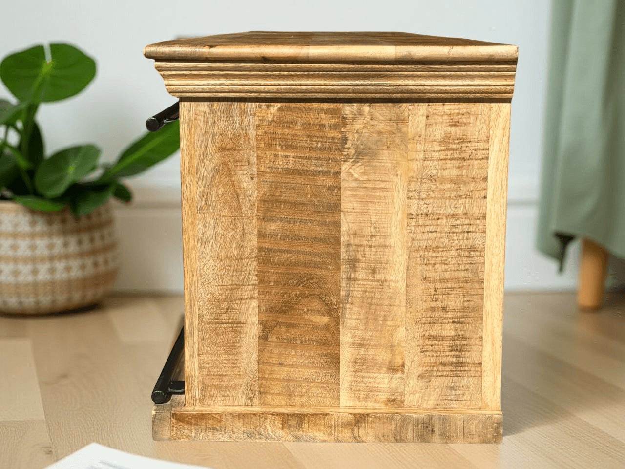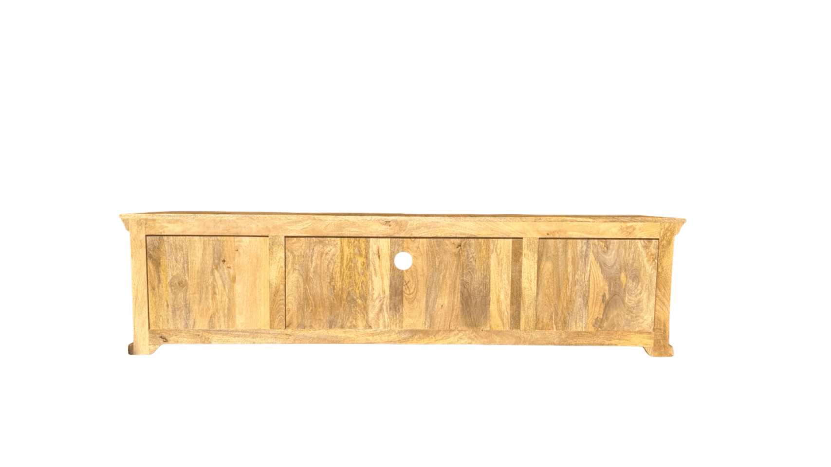 Entièrement fabriqué à la main, ce meuble télé n’est pas un produit standardisé. Chaque pièce est unique, travaillée par des artisans qualifiés. Le bois est traité et verni afin d’assurer une excellente résistance dans le temps tout en mettant en valeur ses veinures naturelles.