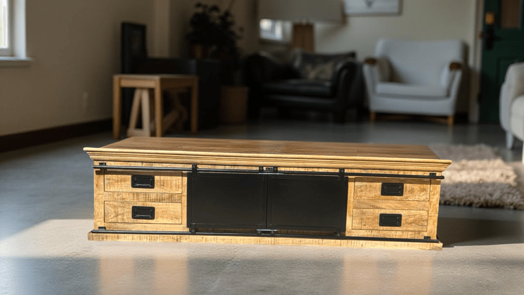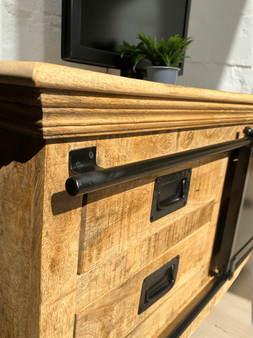 Apportez du caractère à votre intérieur avec le meuble TV industriel Indus. Bois massif de manguier, métal brut, rangements pratiques et finitions artisanales.