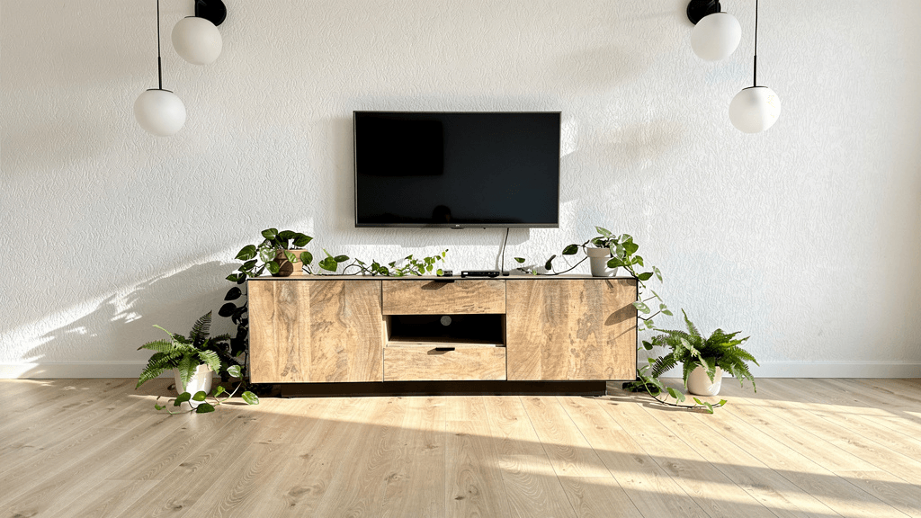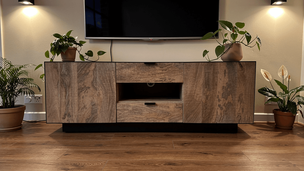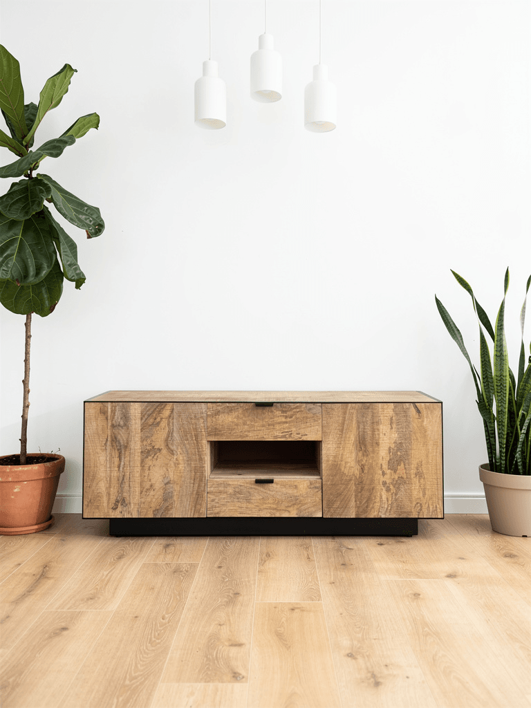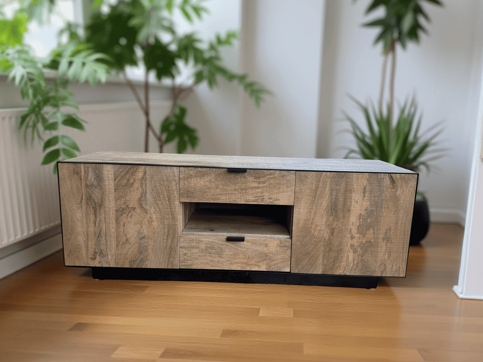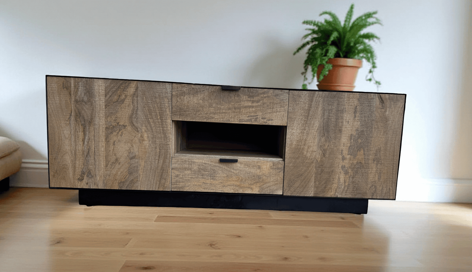 Apportez du caractère à votre salon avec le meuble TV Avignon en bois de manguier massif et métal noir. Son style industriel élégant associe authenticité, robustesse et fonctionnalité. Doté de deux portes latérales et de deux tiroirs centraux, il offre de généreux espaces de rangement pour vos équipements multimédias et accessoires. Chaque meuble est unique grâce au veinage naturel du bois. Stable, durable et livré monté, il s’intègre parfaitement dans un intérieur contemporain ou loft.
