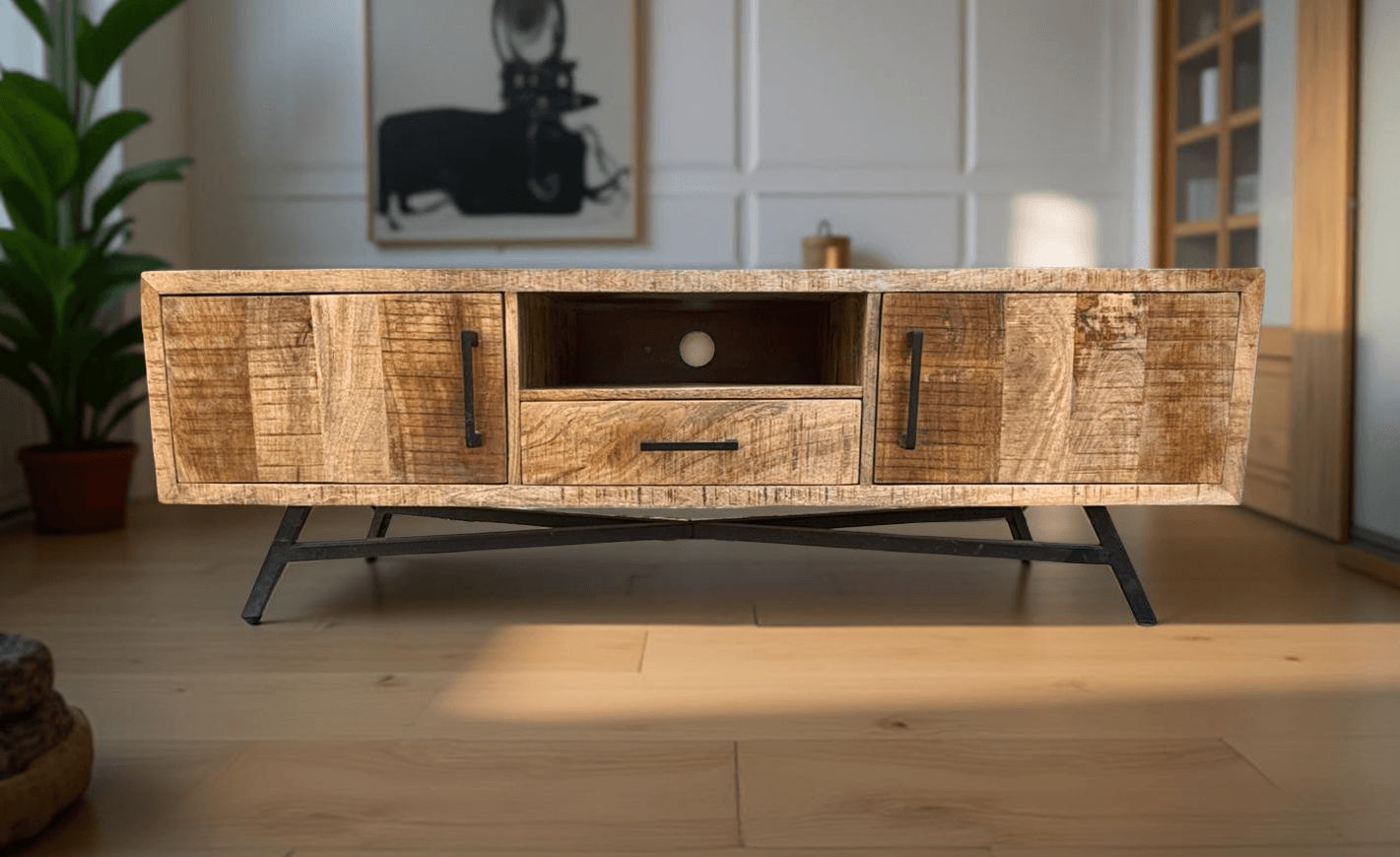 Apportez du style et du caractère à votre salon avec le meuble TV Amiens, conçu en bois massif de manguier et doté d’une structure en métal noir au look industriel affirmé. Fabriqué artisanalement, ce meuble associe robustesse, authenticité et finitions soignées.