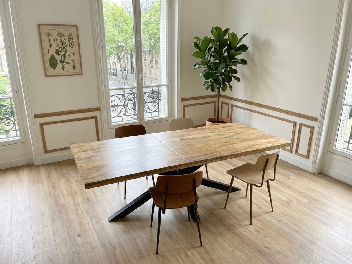 La ligne droite et épurée de la table Garonne en fait une pièce particulièrement polyvalente : elle s’intègre naturellement dans un appartement parisien haussmannien où elle dialogue avec la hauteur sous plafond et la sobriété des moulures, dans un loft contemporain où le métal noir du pied étoile répond aux structures apparentes, dans une maison moderne où la chaleur du manguier tempère la froideur du béton ou de l’acier. Son style se situe à la croisée du design scandinave, du style industriel et du mobilier contemporain — une position rare et précieuse qui lui permet de s’adapter à des univers variés sans jamais paraître déplacée.