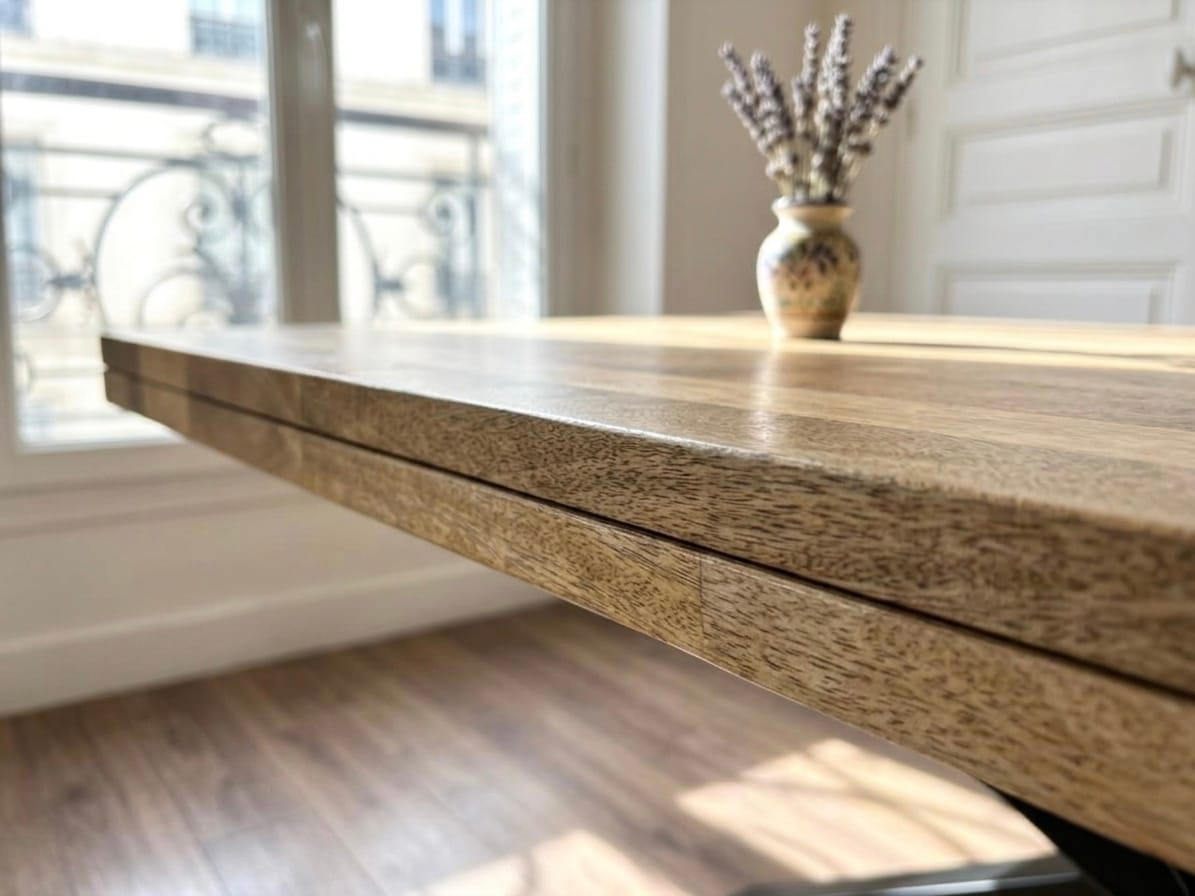 Le poids de la table Garonne est la preuve tangible de la densité du manguier massif et de la qualité de sa construction :