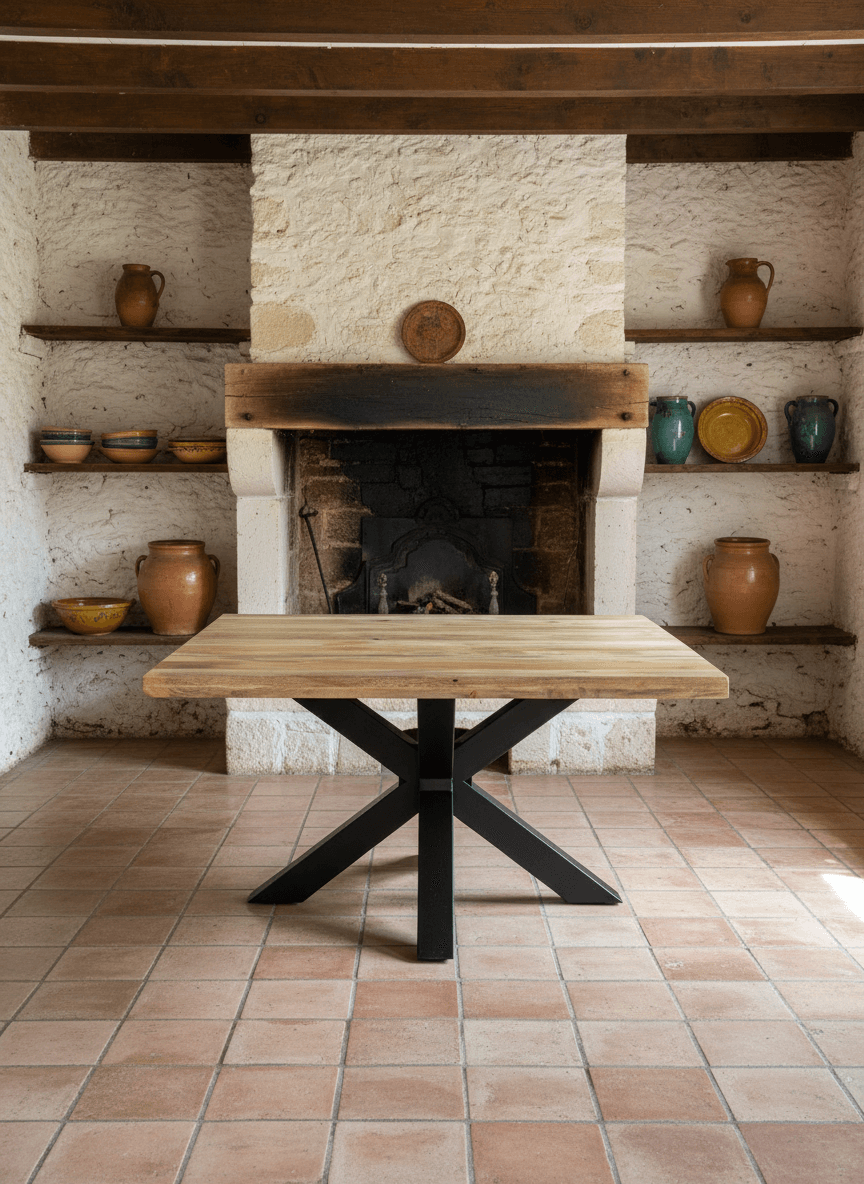 Le pied central en métal noir de la Pareloup joue un double rôle fondamental. D’une part, sa géométrie centrale assure une stabilité irréprochable — même pour un plateau carré de 140 cm et 68 kg. D’autre part, l’absence de pieds d’angle libère totalement l’espace autour de la table. Ainsi, chaque convive s’installe où il le souhaite — côté droit ou côté irrégulier — sans aucun obstacle sous la table. En outre, le métal noir crée un contraste visuel marquant avec la chaleur naturelle du manguier. Par conséquent, le pied n’est pas qu’un support — c’est un élément de design essentiel qui ancre la Pareloup dans le style industriel contemporain.