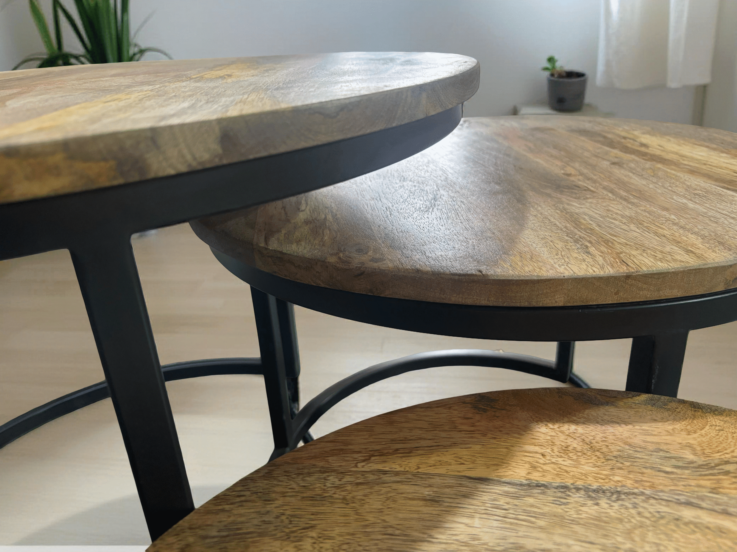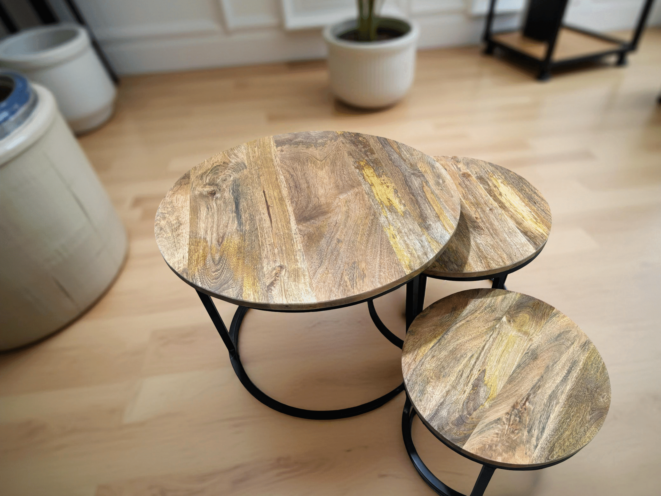 Lot de 3 tables gigognes en manguier massif finition lisse, structure métal robuste. Pratiques, élégantes et au style industriel, elles optimisent l’espace et décorent votre intérieur avec caractère.