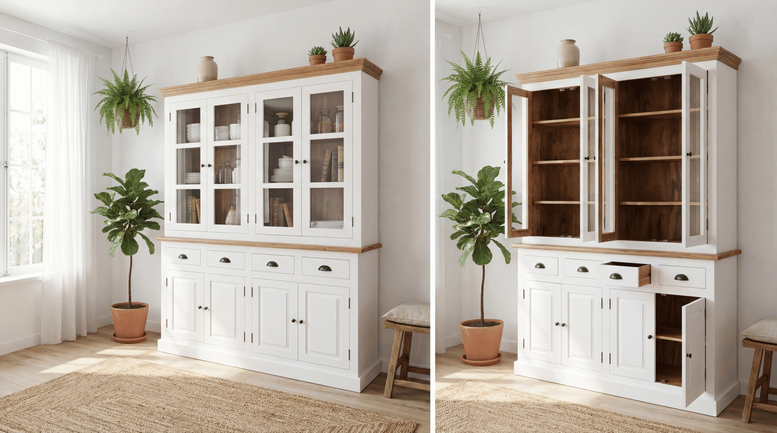 La partie haute est le cœur expressif du vaisselier. Ses 4 grandes portes vitrées — à petits carreaux, dans la tradition des vaisseliers de campagne — permettent de mettre en scène votre vaisselle, vos verres et vos objets décoratifs tout en les protégeant de la poussière. La lumière joue à travers le verre, faisant briller la céramique et le cristal. À l’intérieur, des étagères spacieuses en manguier massif offrent une capacité de rangement généreuse, organisée sur plusieurs niveaux dans chaque moitié. L’intérieur en bois naturel — non laqué — crée un contraste chaleureux magnifique avec la façade blanc laqué.